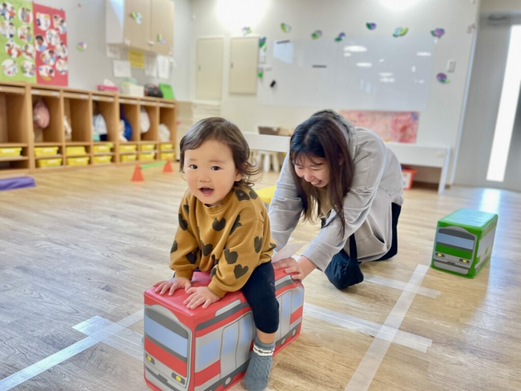 今回は学校全体を開放し、さまざまなアクティビティコーナーを設けました。中でも人気だったのは大きな障害物コースで、トンネル、飛び石、汽車、マットなどを使って、親子で一緒にコースを楽しみました。