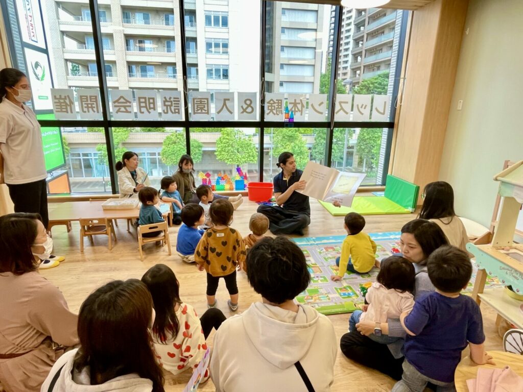 さらに、30分ごとにストーリータイムを開催し、保護者の方とお子さまが一緒に英語の絵本を楽しみながら、英語環境に親しむ時間も設けました。