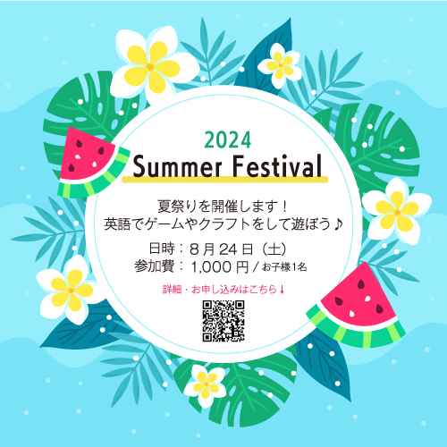 8月24日土曜日に夏祭りを開催します♪ 英語でゲームやクラフトなどをしてたくさん遊ぼう!