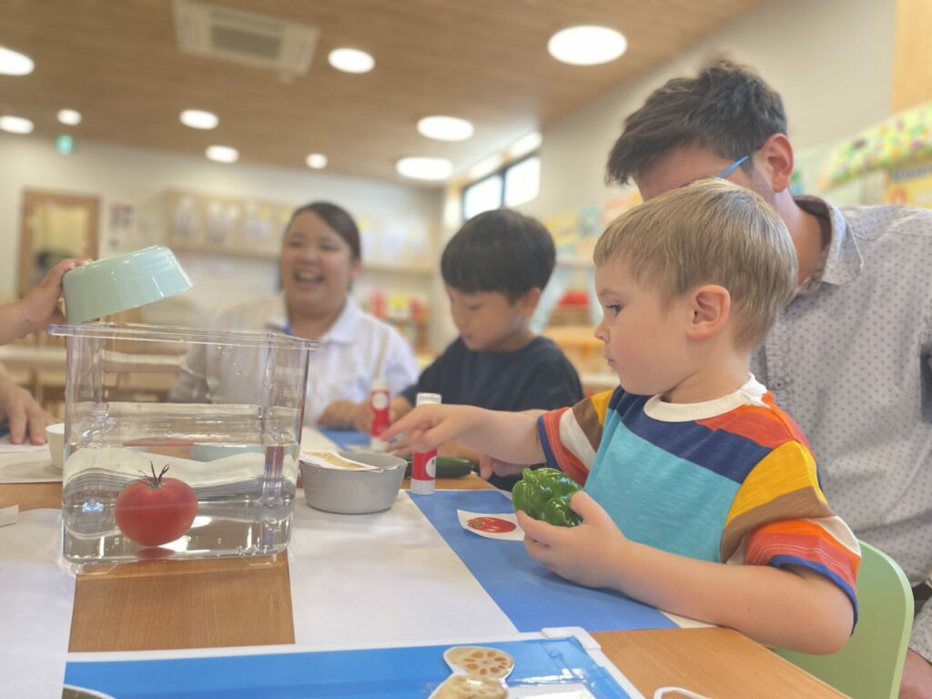 石けんが固まるのを待つ間には、野菜や果物が浮くか沈むかを調べる科学実験を行いました。3つのグループに分かれてチームメンバーと自己紹介をした後、きゅうり、たまねぎ、トマト、パプリカ、れんこん、じゃがいも、りんごの7種類を水に入れて検証。事前に「浮く/沈む」を予想してから実際に試し、地下で育つ野菜は沈み、地上で育つ野菜は浮く傾向があるということを発見しました。ただし、トマトは沈み、LocoDoorの先生が「甘いトマトは沈むことがある」と教えてくれました。