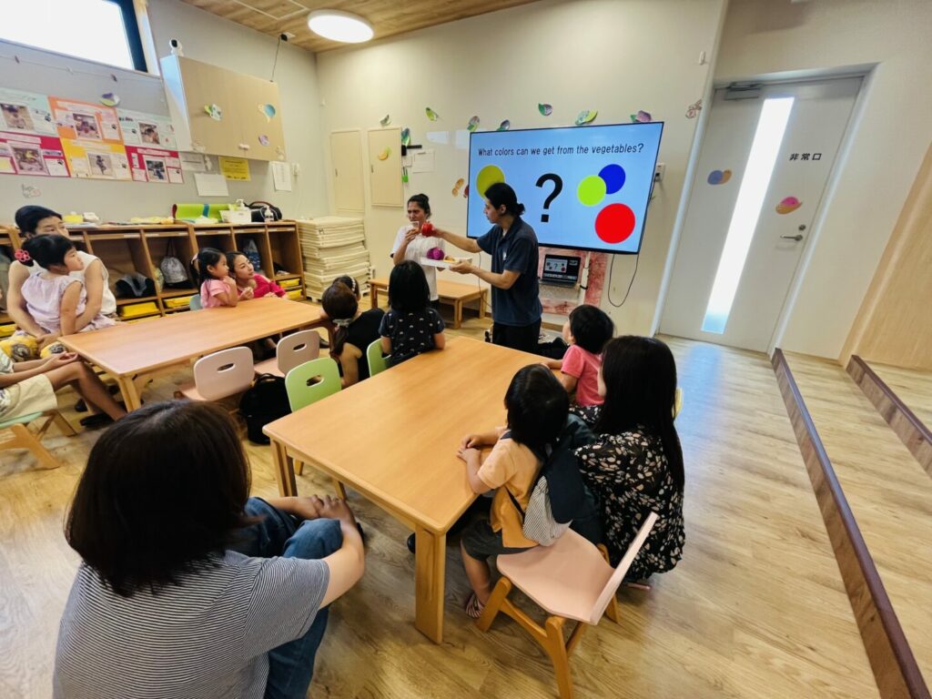 イベントは年齢別に2つのセッションに分けて行いました。最初のセッションでは、2歳までの子どもたちが対象で、英語で色や野菜の名前を学びました。赤や黄色のパプリカ、にんじん、紫キャベツなどから抽出した自然の色水を使って石けんを作り、型に流し入れて固まるのを待つ間には、パラシュートを使った遊びや、野菜のおもちゃを使った活動、絵本を楽しみました。その後、野菜をスタンプ代わりにしてうちわをデコレーションし、出来上がった石けんをラッピングして持ち帰りました。