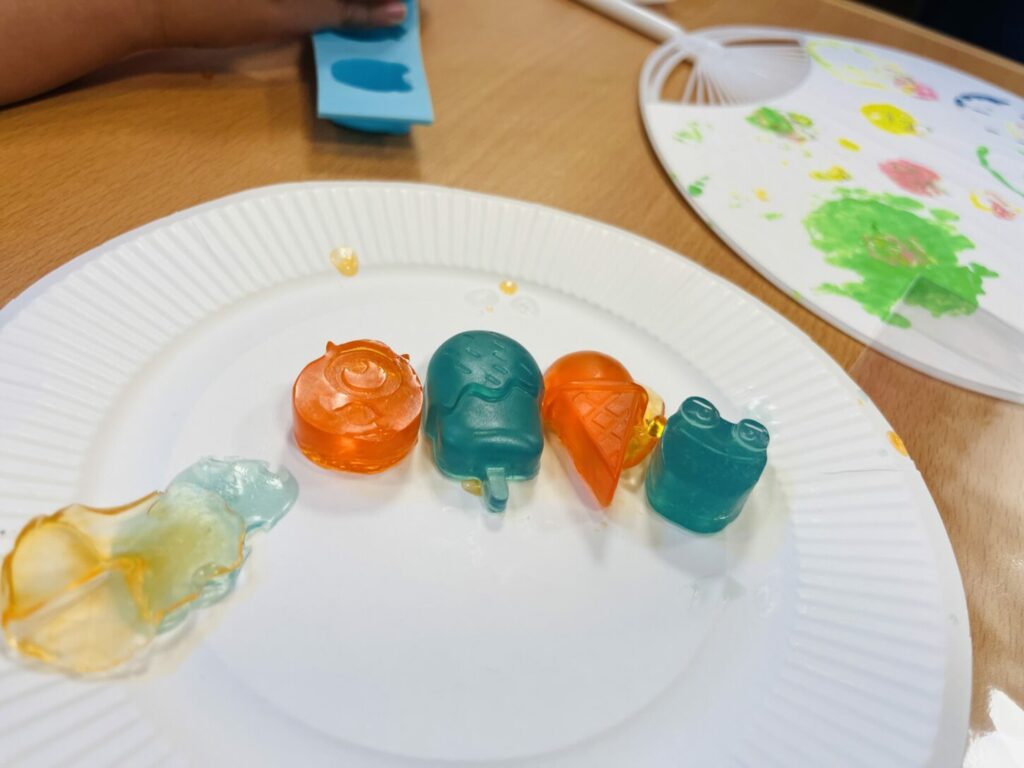実験の後は、野菜スタンプを使ってうちわをデコレーションし、色を混ぜながらオリジナルの色合いを作る楽しさも味わいました。最後に、固まった石けんをラッピングし、Beyondia Loungeエリアでアイスクリームカートや風船などを使って自由遊びを楽しみました。