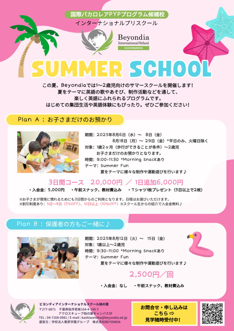 Beyondia International School Kashiwanohaでは、この夏、1〜2歳児向けのSummer Schoolを開催します。