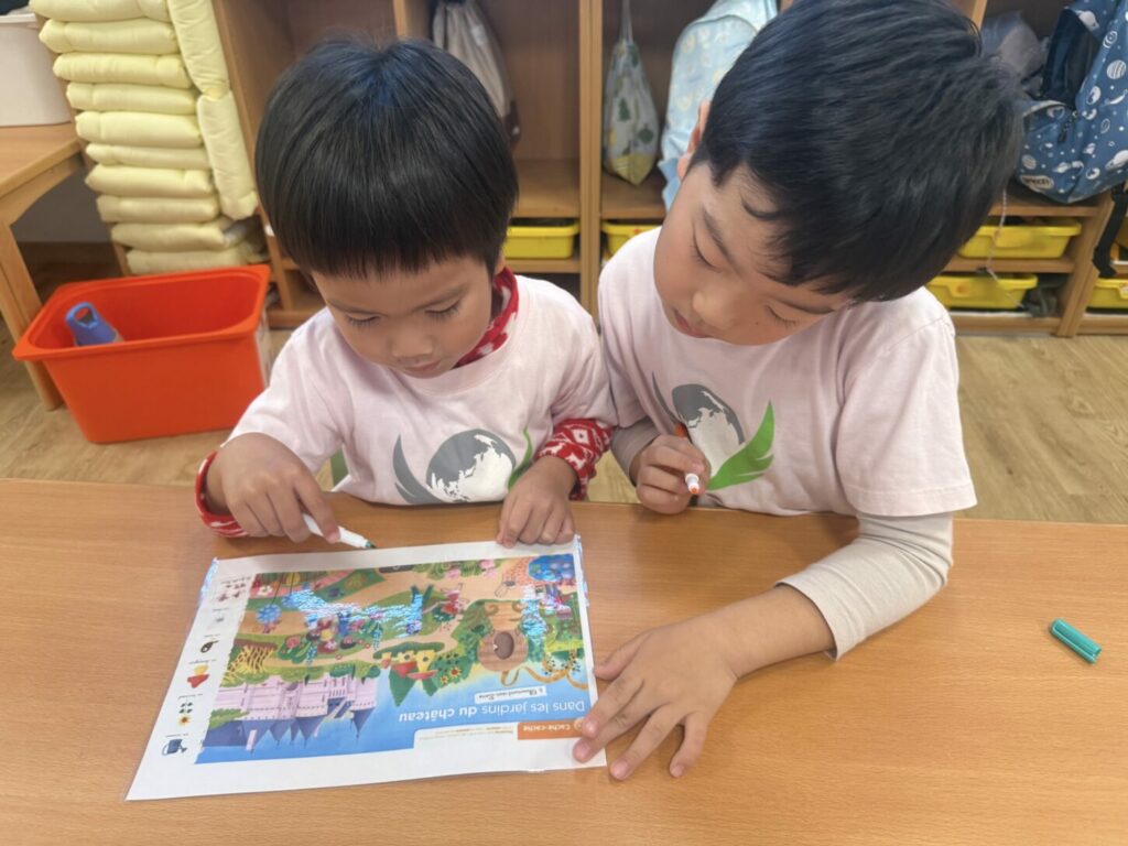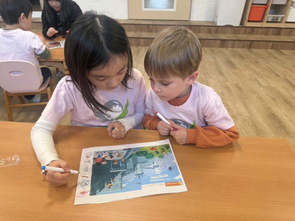 We compared castles in Japan with castles in France. Through this comparison, the children learned that kings, queens, and knights lived in French castles long ago. A pair “seek and find” activity encouraged careful observation, communication, and teamwork.