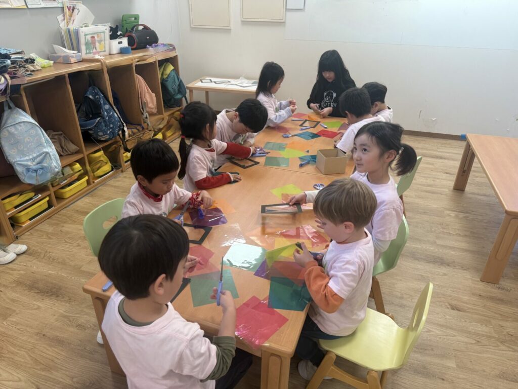 最後に、ステンドグラスをイメージした工作活動を行いました。この活動を通して、創造力や指先の発達、自己表現を育みながら、フランスの文化への理解を深めることができました。