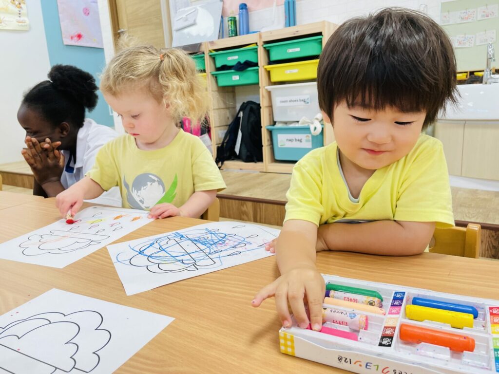 特にナーサリークラス(1〜2歳)の子どもたちにとっては、初めてしっかりと体験する「夏の始まり」でした。私たちは、季節に合わせた製作活動や感覚遊び、そして「Rain Rain Go Away(あめあめ ふれふれ)」のような英語の歌を使って、雨の季節をテーマにした楽しいレッスンを行いました。