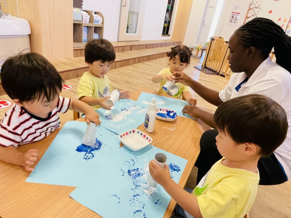 午後のアクティビティでは、梅雨にちなんだお話やゲームを楽しみました。大きな傘を使って雨の中を歩くごっこ遊びや、絵の具を使ったアート活動など、子どもたちは創造力を膨らませながら笑顔で取り組んでいました。