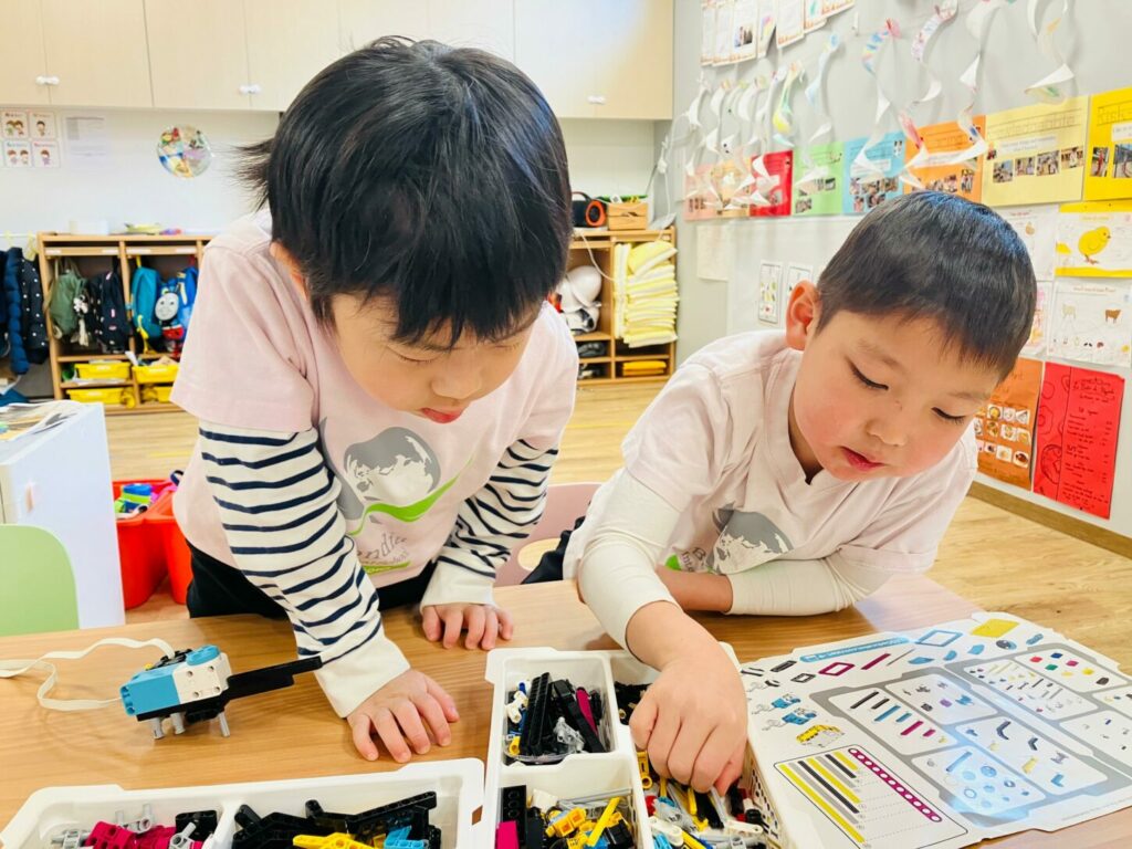 Each session follows a theme, and assembling a different robot each time is an exciting experience for the children. Working in pairs, they discuss, divide tasks, and go through trial and error, naturally developing teamwork and logical thinking skills.