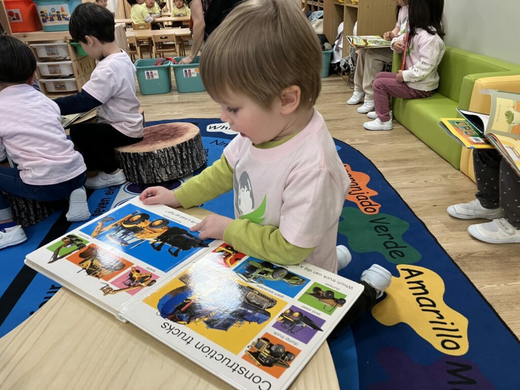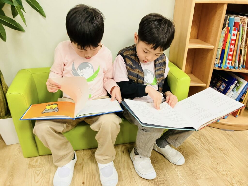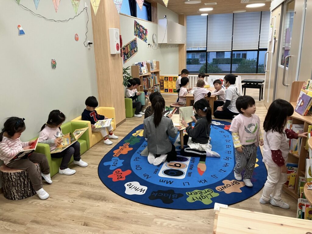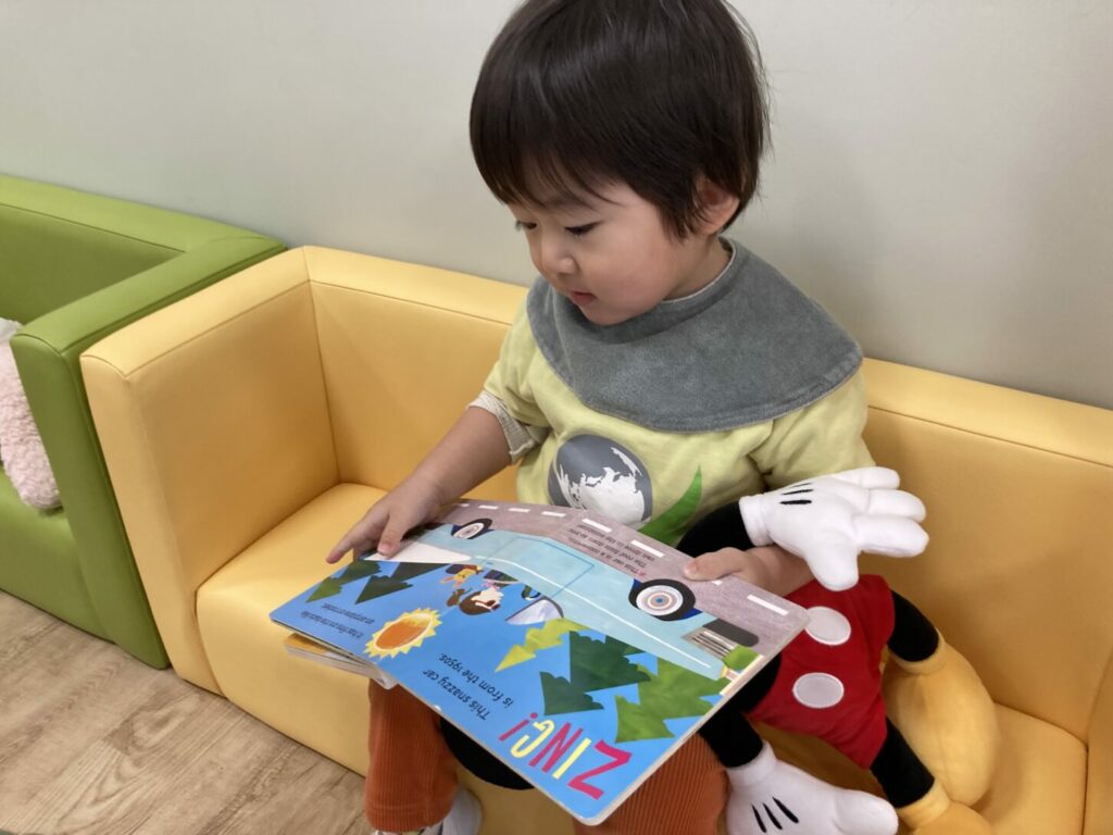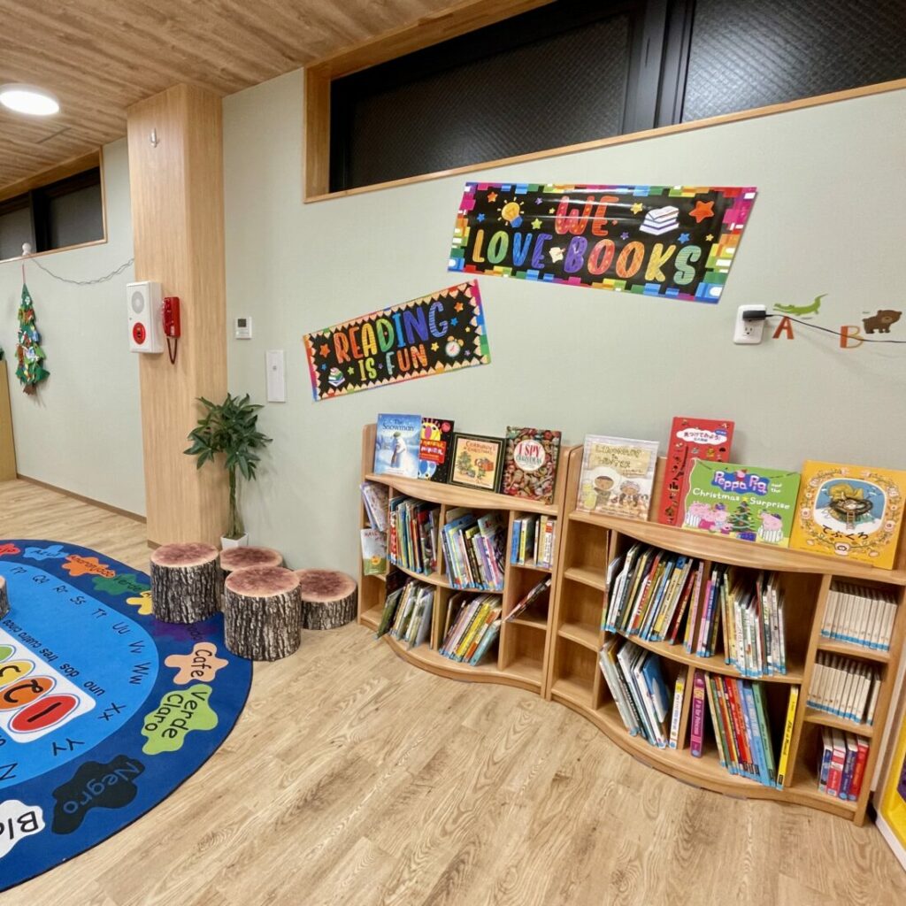 Libraryコーナーでは、子どもたちが自由に絵本を選び、好きな場所で読んだり、お友達と絵本の内容について話したりしています。本に触れることで、より豊かな想像力や言葉の世界が広がっていきます。