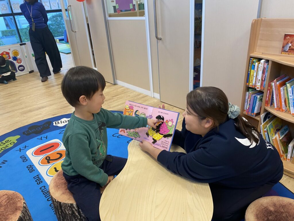 また、週に2回、絵本を借りて家で保護者の方と一緒に読める機会もあります。ご家庭でも絵本の読み聞かせを楽しんでいただけるようになっています!保護者の方からは、「英語の本にたくさん触れられて嬉しいです。」「子どもが自分で選び、借りてきた本なので、嬉しそうに何度も読んでいます」「親子で一緒に楽しんでいます」といった嬉しい声もいただいています。