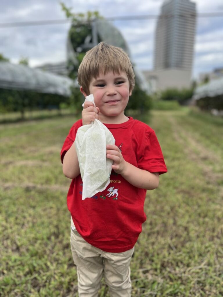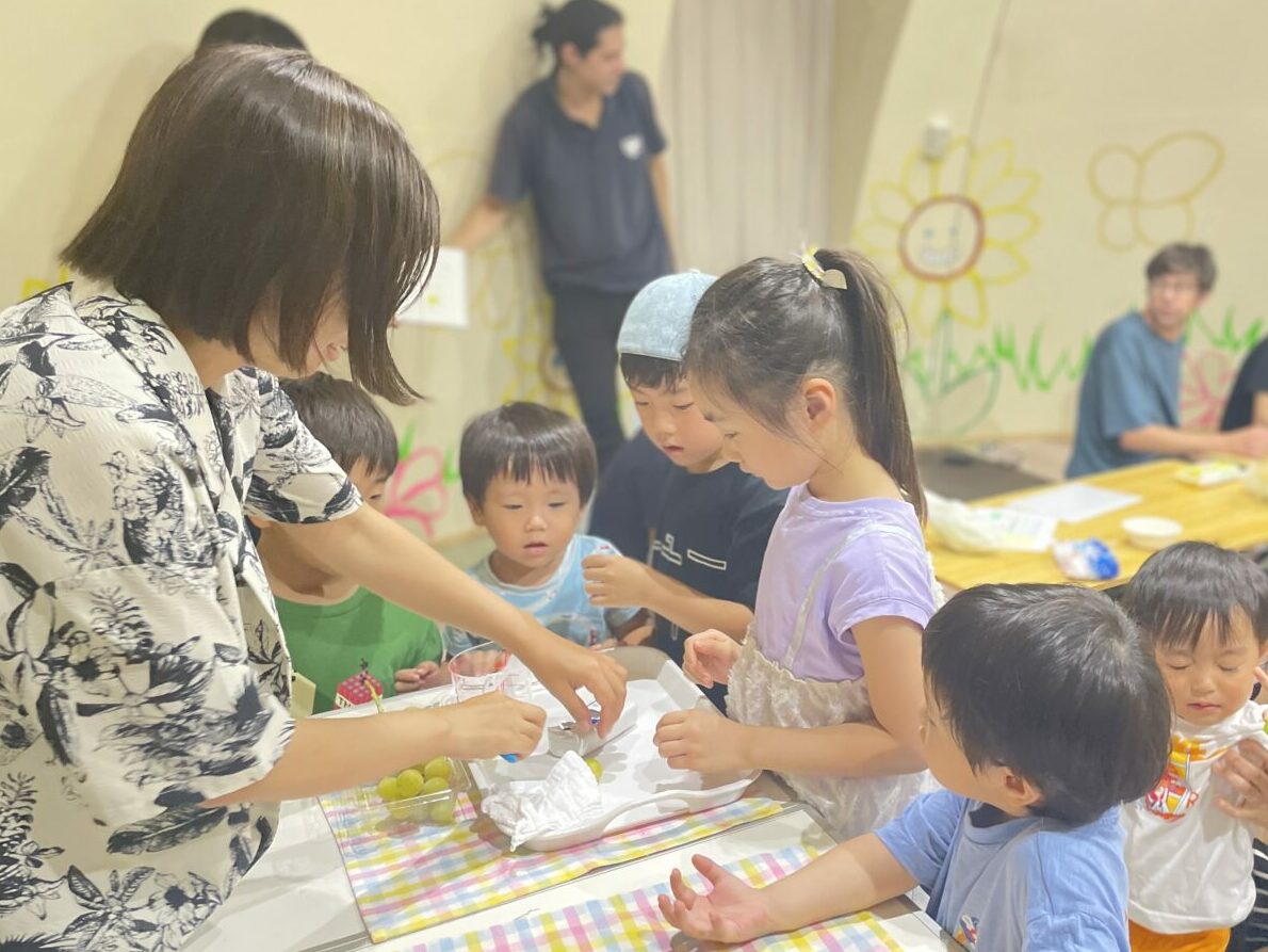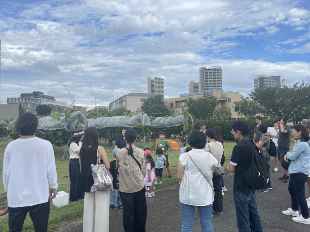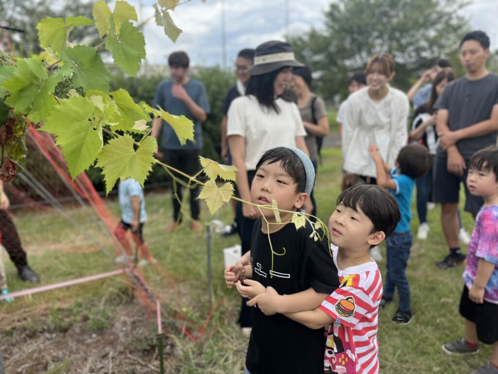 集合場所には、友達や先生に会えること、そしてもちろん美味しいぶどうを収穫して食べられることにワクワクした子どもたちとご家族が、笑顔で集まってきました。