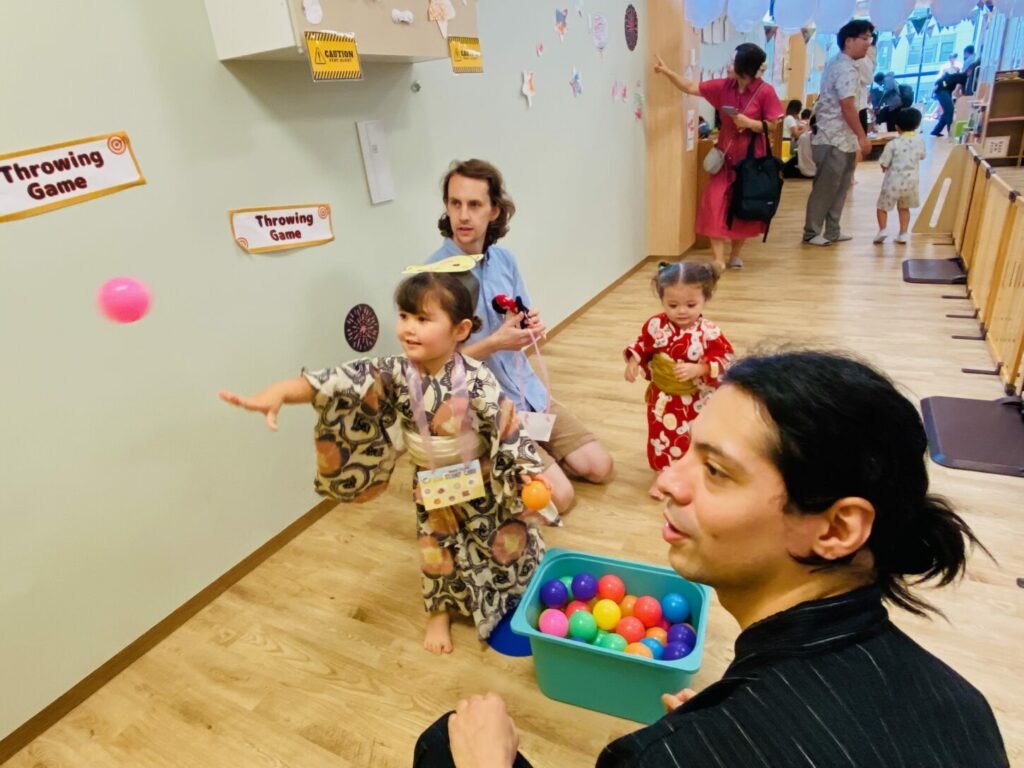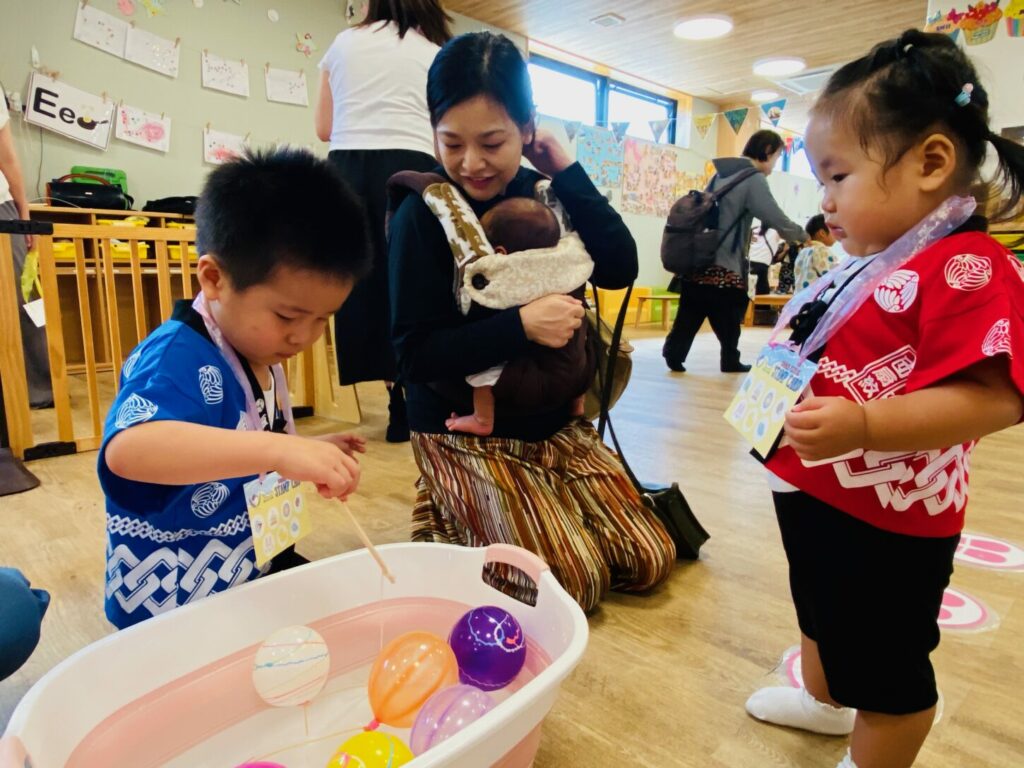 子どもたちは色とりどりの装飾の中で自由に遊び、楽しみながら自分を表現してくれました。保護者の皆さまも交流を深めながら、一緒に夏祭りならではの雰囲気を楽しんでいただけたのではないかと思います。