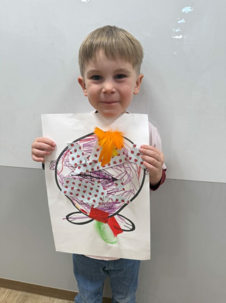 In the afternoon, the children created their own Halloween monsters using a variety of materials. They began by coloring monster outlines and then decorated them with origami paper, feathers, stickers, and colored tape. Each creation was unique — some monsters had multiple heads, hands, or eyes, while others resembled skeletons. This activity promoted imagination, decision-making, and confidence in self-expression.