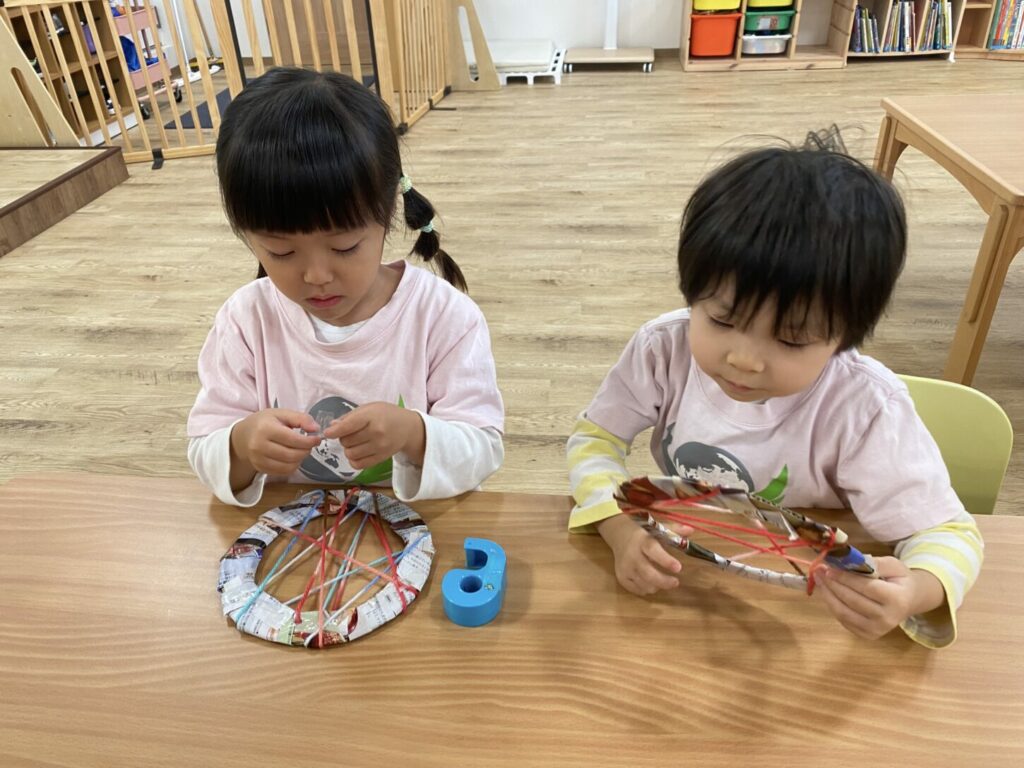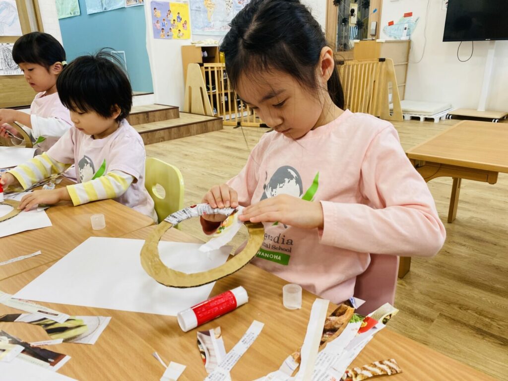 このハンズオン活動は、切る、貼る、糸通しなどの手先の器用さを育みます。また、算数の要素も取り入れ、子どもたちは切った新聞紙の本数を数えながら、「5本切ったから、あと3本必要だ!」と声に出して数えることで、自然に算数とアートが結びつきました。