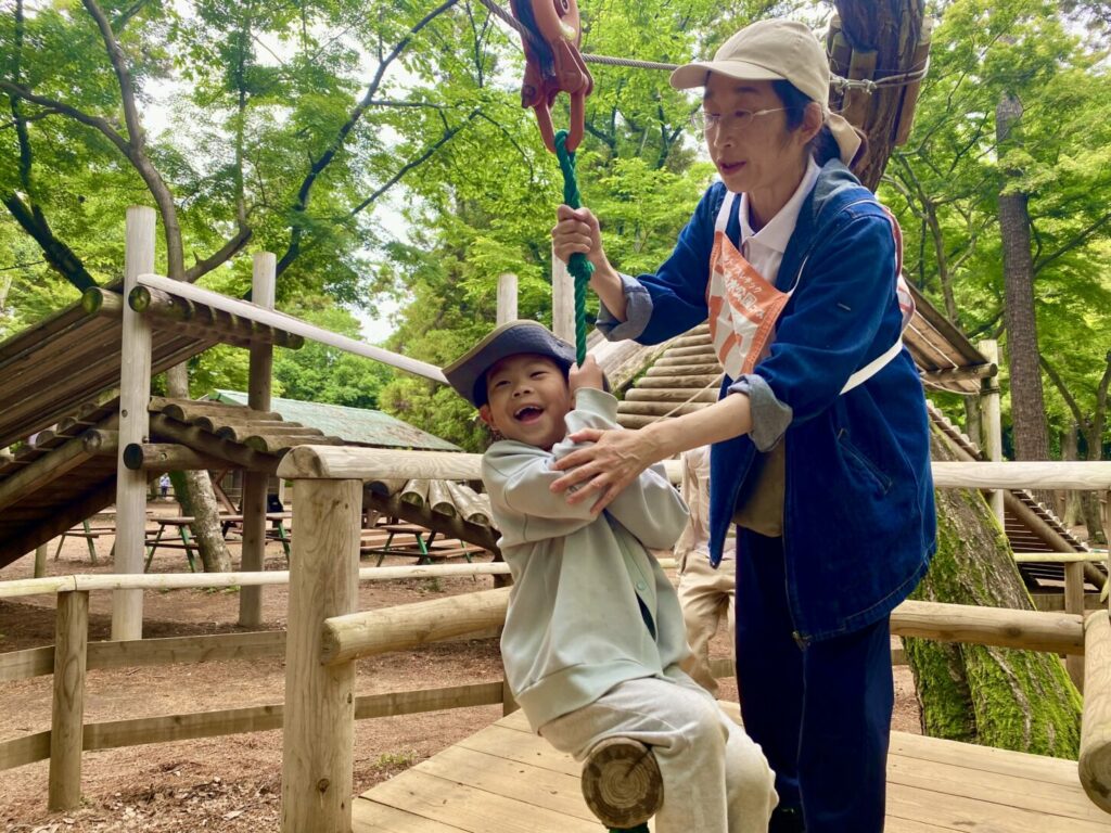 次は、小さなクライミング遊具がたくさんあるエリアに移動しました。そこでは、ロープブランコが一番人気でした!子どもたちは順番を守って楽しく遊びました。また、医者と患者のごっこ遊びもして、子どもたちの想像力に感心しました。