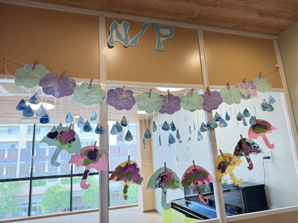 特にナーサリークラス(1〜2歳)の子どもたちにとっては、初めてしっかりと体験する「夏の始まり」でした。私たちは、季節に合わせた製作活動や感覚遊び、そして「Rain Rain Go Away(あめあめ ふれふれ)」のような英語の歌を使って、雨の季節をテーマにした楽しいレッスンを行いました。