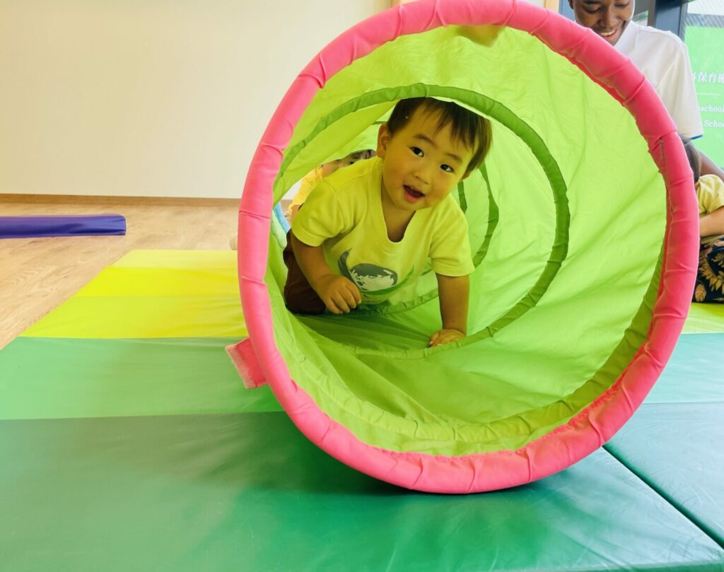 子どもたちがトンネルをくぐるたびに、笑い声と歓声が教室に広がりました。友だちの中には、先生と一緒に「ゴー!ゴー!」と応援する子もいました。この楽しい経験を通して、子どもたちは共感や協力の大切さ、そして友だちの成功を喜ぶ気持ちを学びました。