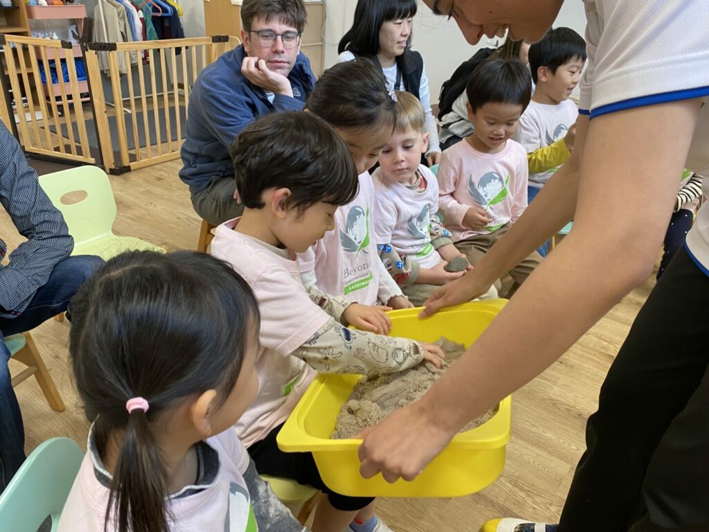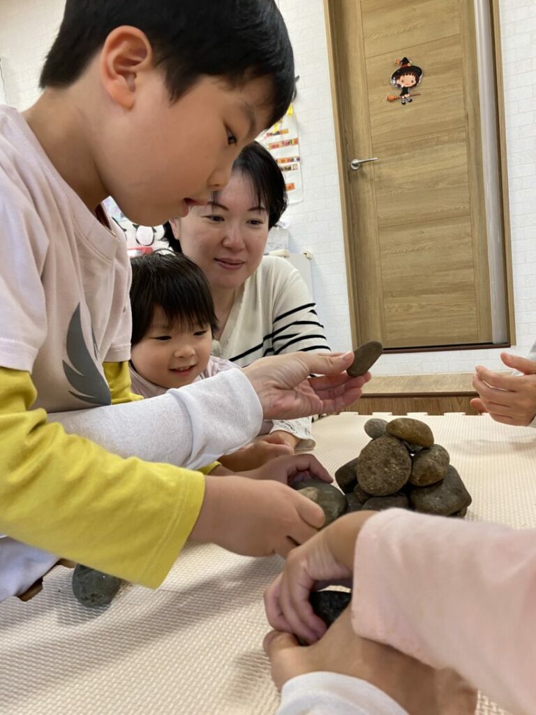 その後、保護者も参加してのゲームを行いました。子どもたちはそれぞれ岩を選び、「一番大きい岩はどれ?」「一番平らな岩はどれ?」といった基準でペアと比較しました。条件に合った岩を持っている子どもは手を挙げ、みんな楽しみながら学びました。