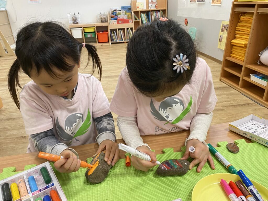 最後に、子どもたちはアート&クラフトの時間を楽しみました。岩に色を塗ったり絵を描いたりしながら、学んだことを表現しました。この活動を通じて、自分を表現する力を育むことができました。