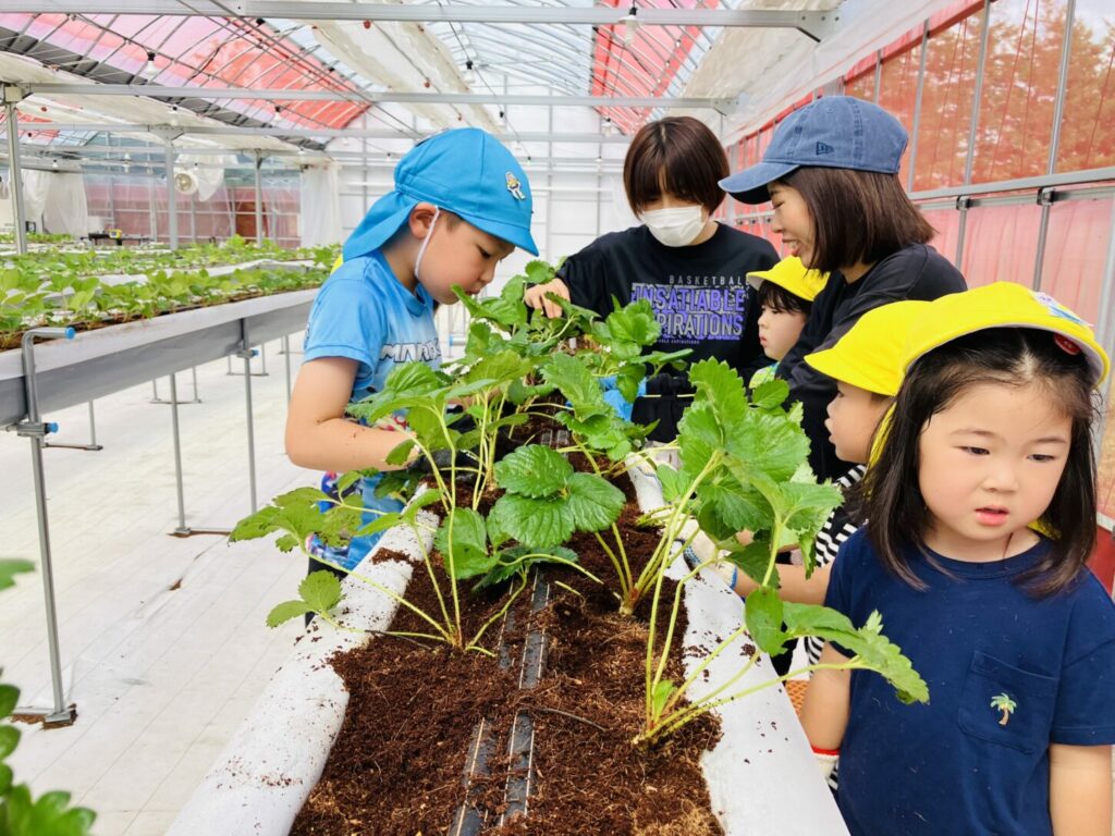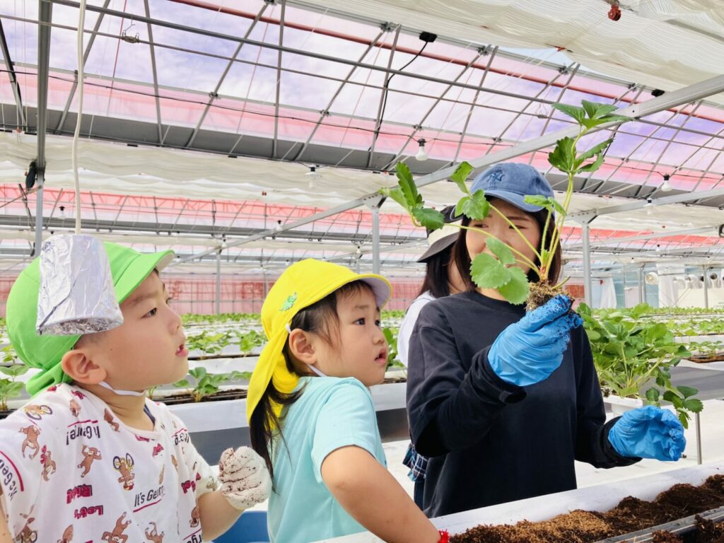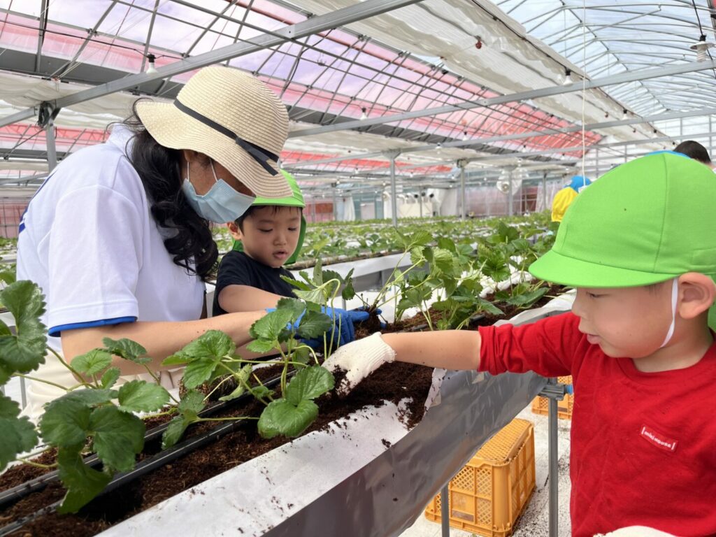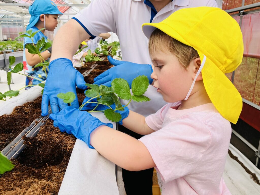At the strawberry greenhouse, the children wore gloves and worked hard planting strawberry saplings. They learned about the process of growing food. Afterward, K2 and K3 had a special tour to see banana trees, grapevines, fig trees, and Japanese pears.