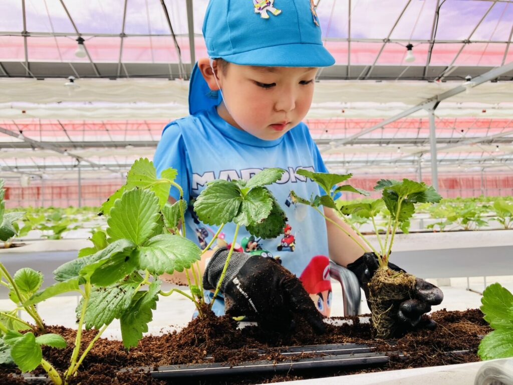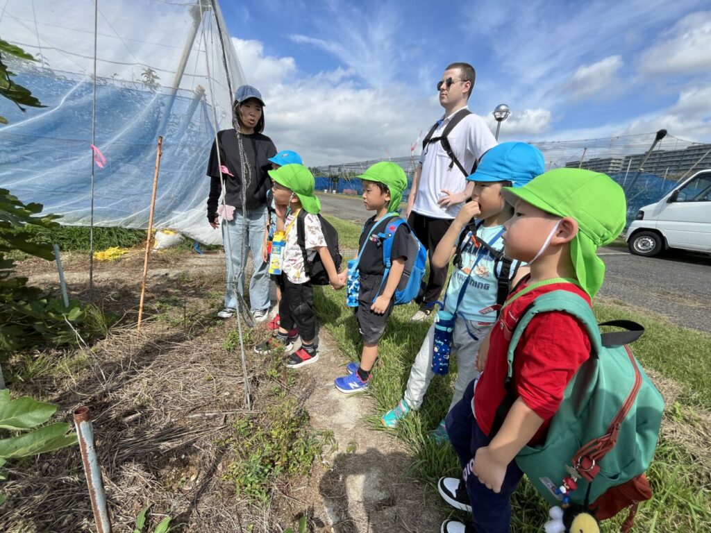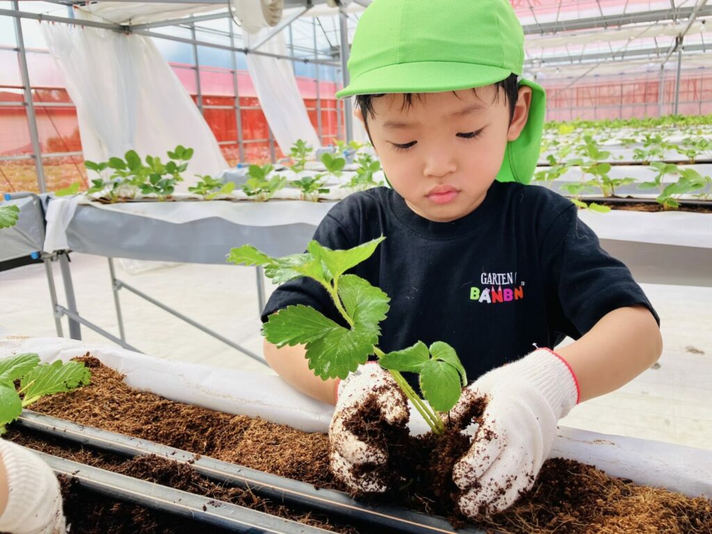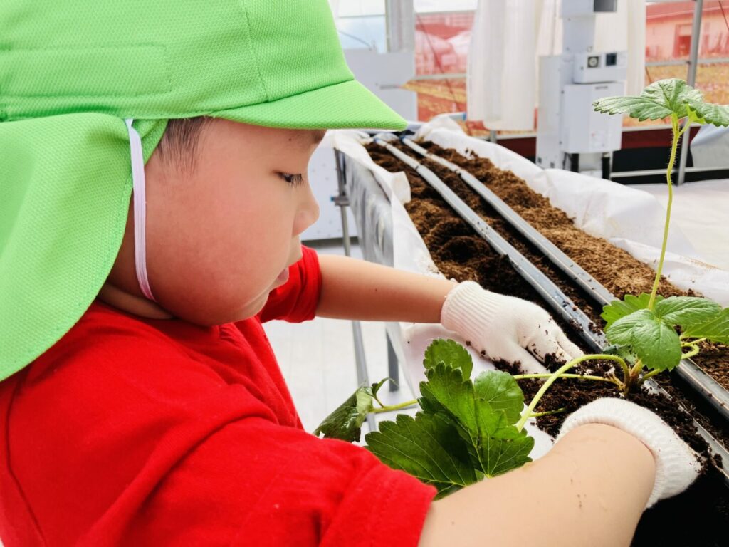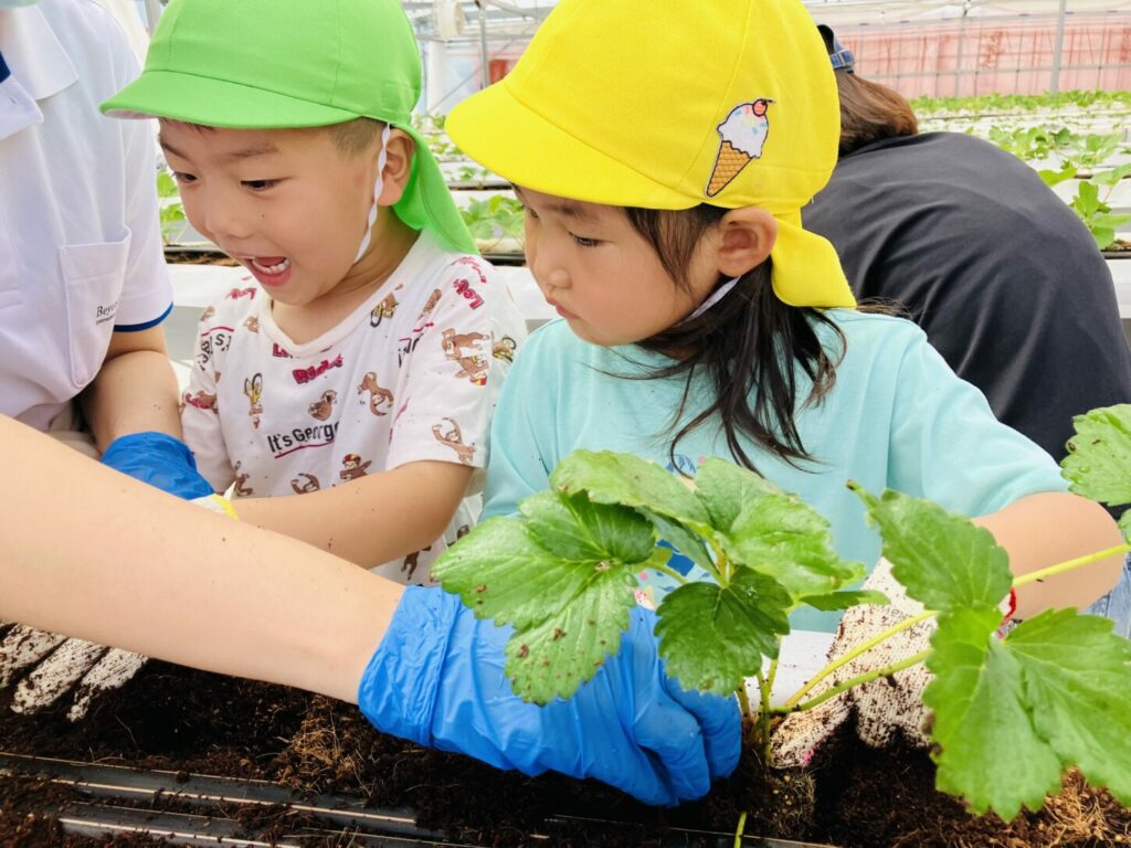 At the strawberry greenhouse, the children wore gloves and worked hard planting strawberry saplings. They learned about the process of growing food. Afterward, K2 and K3 had a special tour to see banana trees, grapevines, fig trees, and Japanese pears.