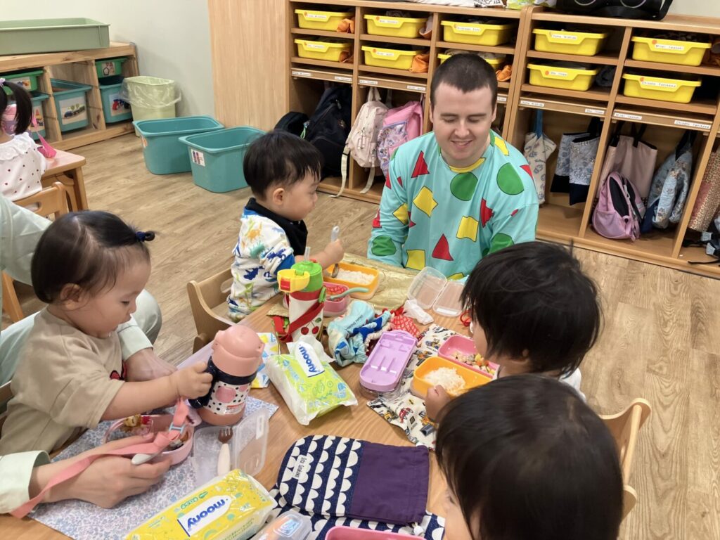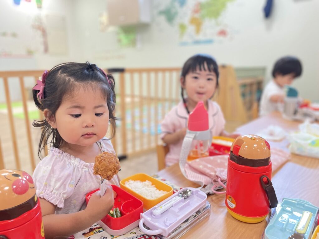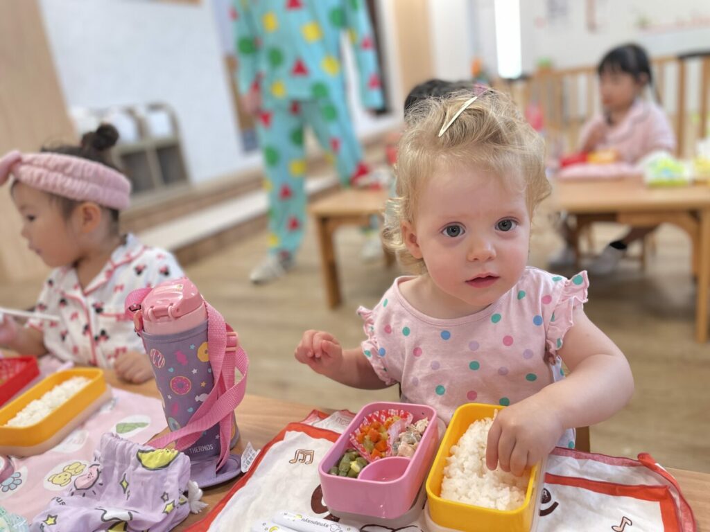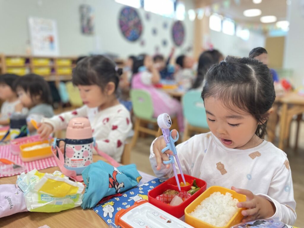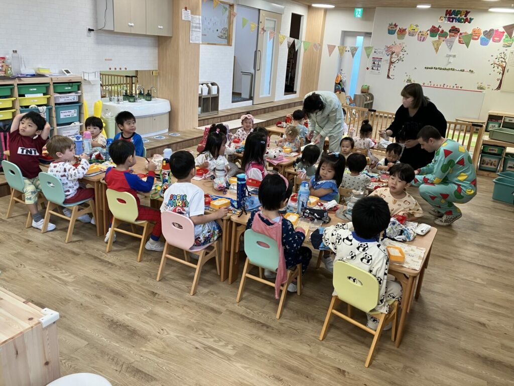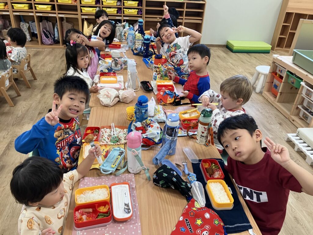 ランチはKinderとN/Pre合同で行いました。みんなで給食を食べて、とても賑やかで楽しかったです。Kinderのおにいさん、おねえさんたちは、完食する子も多くて頼もしいと思いました。