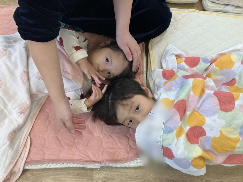 お昼寝も一緒にしました。マットの上にごろんとした時が、1日を通して一番、Pajamaがしっくりきていました。