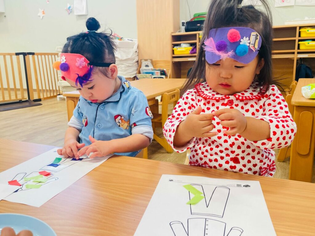プリクラスでは、少しレベルアップ!スティックのりを使って、フェルトの形をパジャマのいろいろなところに貼りつけました。のりの使い方もとても上手になり、飾りを丁寧に貼る姿に子どもたちの成長を感じました。毎日少しずつ、できることが増えています。