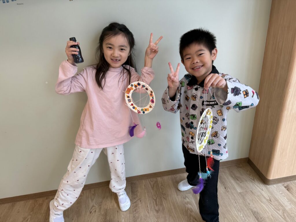 Kinderクラスでは、朝の時間にクラフト活動から一日をスタートしました。K2とK3の子どもたちは、紙皿に毛糸や羽、ビーズを使って美しいドリームキャッチャーを作りました。それぞれの子どもが、自分で材料を選び、組み合わせながら素晴らしい創造力を発揮していました。