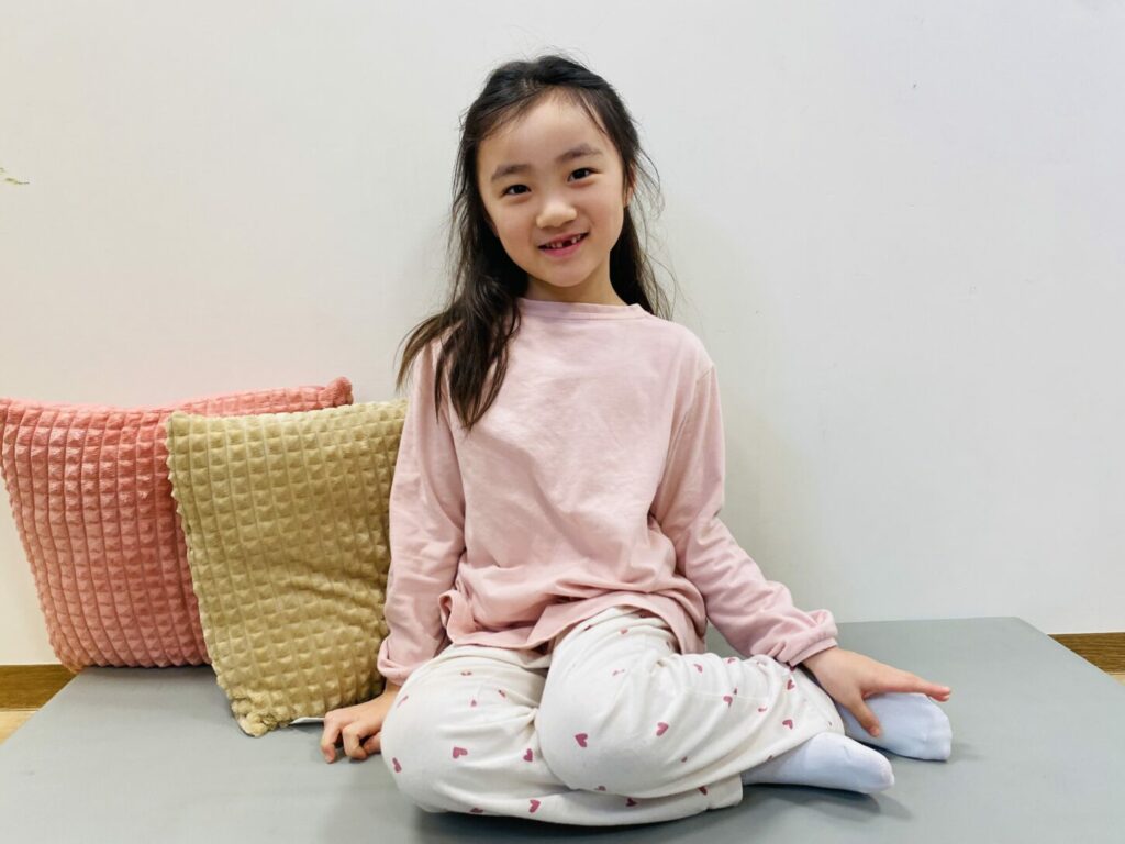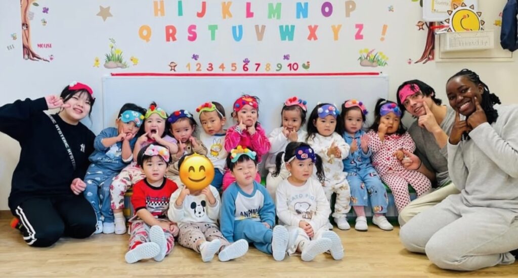 午後は、Kinderクラス全員でテーマに沿った楽しいゲームをしました。子どもたちは二つのチームに分かれ、枕を頭の上でパスしたり、足の下でパスしたりするゲームを行いました。みんな元気いっぱいで、友達を応援しながら楽しんでいました。ゲームの後は、パジャマをテーマにした工作を行い、自分の着ているパジャマと同じデザインに塗り絵をして、顔を貼って完成させました。