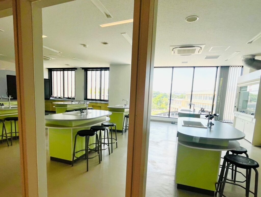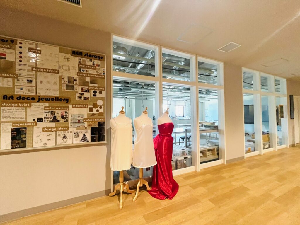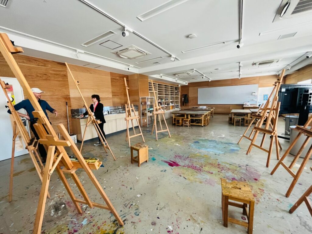 次に案内していただいたのは教室エリアです。Rugby School Japan には幅広い教科が用意 されており、それぞれの教室に十分なスペースと専門設備が整えられていました。物理・ 生物・化学には専用の実験室が複数設けられ、本格的な探究活動が日常的に行われている ことが伺えました。美術室は広く、生徒が自由に創造性を発揮できるよう配慮されてお り、デザイン&テクノロジーの教室では、生徒が制作した実際に動く時計が展示されてい て、探究と創造が自然につながっていることに感動しました。こうした学びの空間から は、生徒に多様な経験と学びを提供しようとする学校の思いがしっかりと伝わってきまし た。
