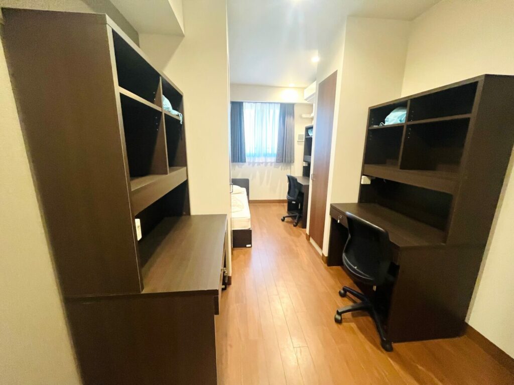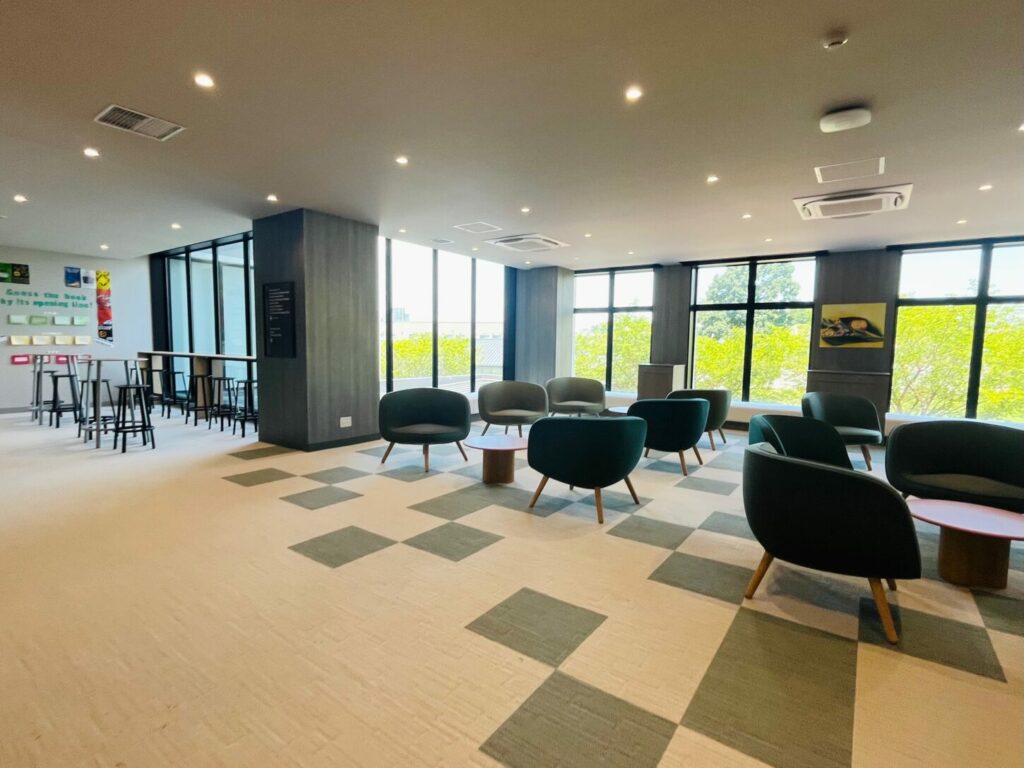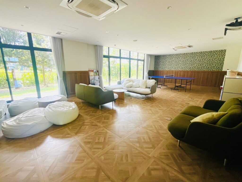見学は寮エリアから始まりました。校内には6つの寮があり、通学生も寮生も利用できる設計になっています。寮内にはリラックスしたり、食事や会話を楽しんだり、そして何より先生やクラスメートと一緒に宿題に取り組める共用スペースが設けられており、日々の生活の中で自然と学びが生まれる環境になっていました。個室も完備されており、静かに勉強したり休んだりする時間も確保されています。通学生もこの寮を利用することで、寮生との垣根なく学校全体としてのコミュニティが形成されている点がとても印象的でした。