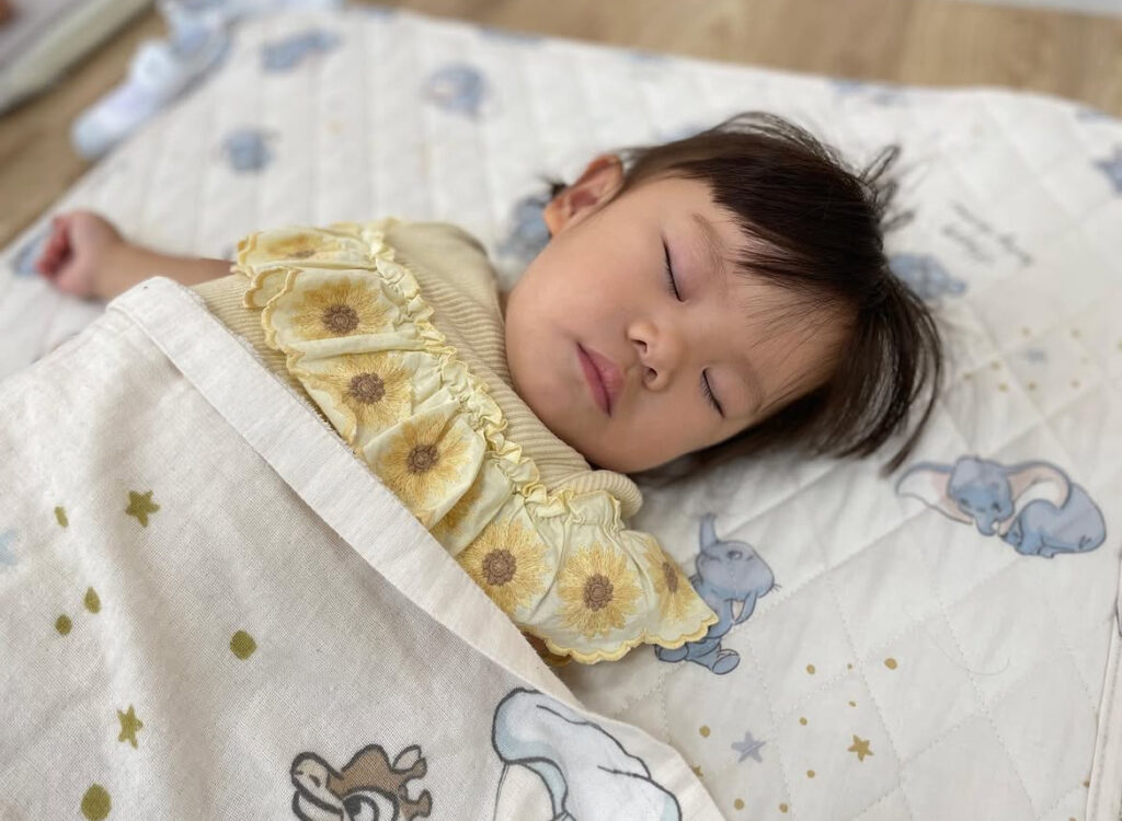 年に1回、アポロデンタルクリニックの歯科衛生士の学生さんたちが来園し、4〜5歳児クラスの子どもたちに正しい歯の磨き方やお口の健康について楽しく指導してくれます。遊びや体験を通して、子どもたち自身が歯の大切さを学べる機会となっています。 - 午睡時の呼吸チェック
