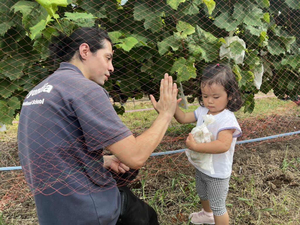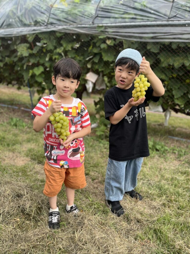集合場所には、友達や先生に会えること、そしてもちろん美味しいぶどうを収穫して食べられることにワクワクした子どもたちとご家族が、笑顔で集まってきました。