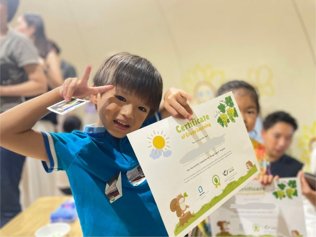 At the vineyard, the excitement really began! Each family had the chance to pick one bunch of grapes before returning to the dome to learn how to check sweetness levels—and, of course, taste the grapes themselves. After the tasting, everyone received their very own Grape Expert Certificate, celebrating their new knowledge.