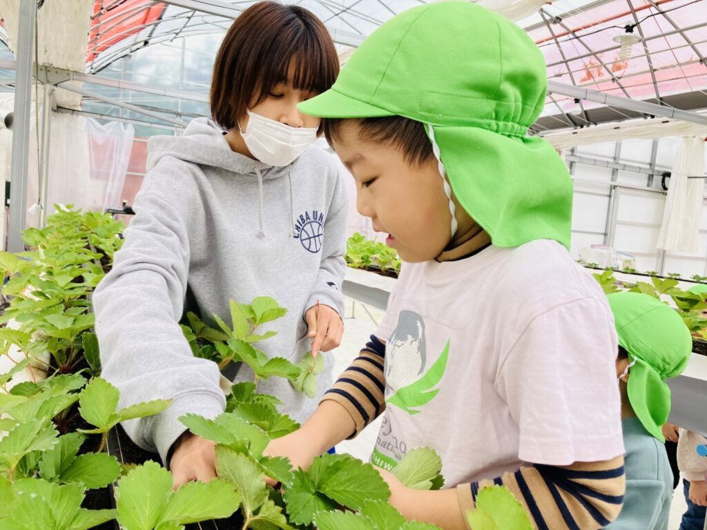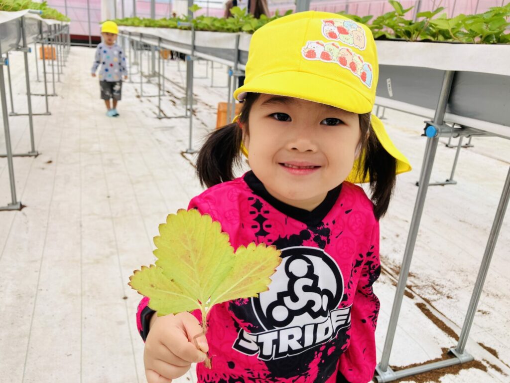 We then helped the strawberries grow stronger by pruning some extra leaves. The children carefully removed leaves in small groups, asking, “Can we take this one off?”