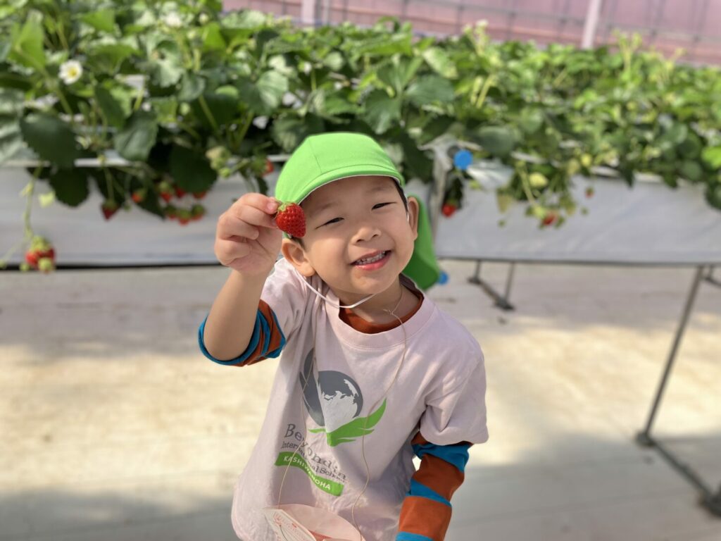 Kinderクラスの子どもたちは、9月に植えた いちごをついに楽しむことができました。毎月、いちごの成長を見に行きました。余分な葉を取り除いたり、小さなブラシを使って受粉を助けたりしながら、大切にお世話をしました。