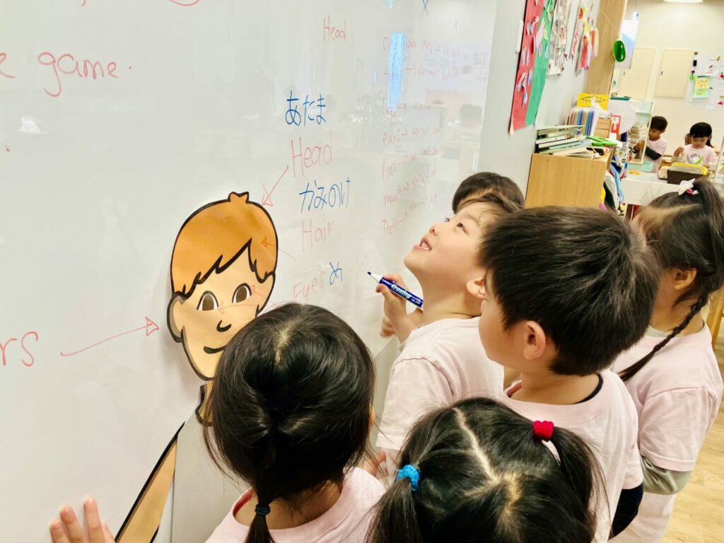 To kick off the unit, we started with a group discussion about the different parts of the body and why we need them. The children were enthusiastic and eager to share what they knew! ユニットのスタートとして、まずは体のいろいろな部分について、そしてそれらがなぜ必要なのかについてグループで話し合いました。子どもたちはとても意欲的で、知っていることを楽しそうに共有してくれました。